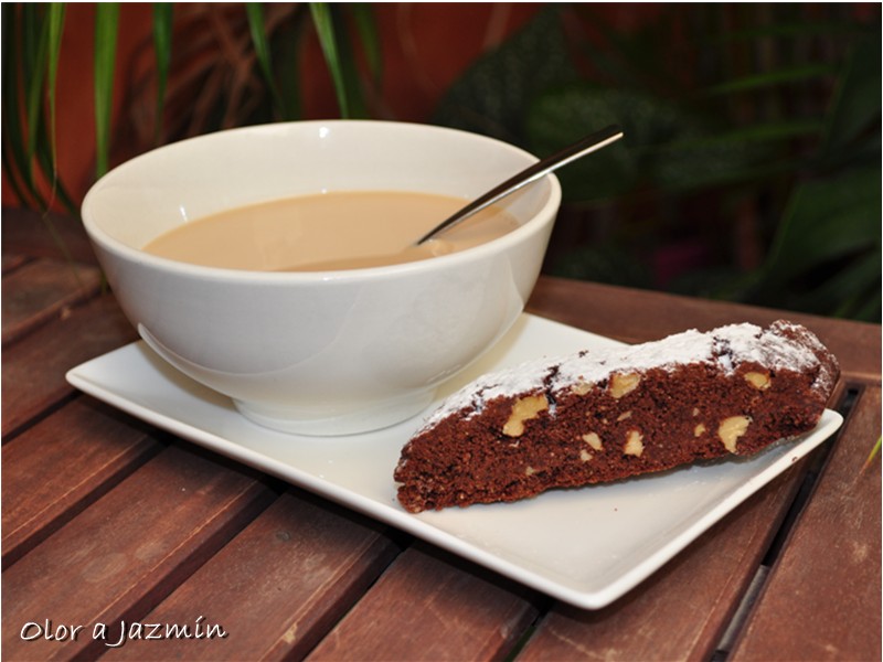 He llegado a tu blog, no por el "olor a jazmin", pero si por estos biscottis de chocolate, yo los he hecho normales, pero la próxima vez caen fijos de chocolate. Bss.